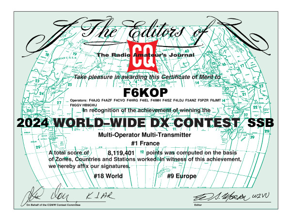 F6KOP | 2024 | F | 14 | MULTI-MULTI | 8,119,401 | 6,835 | 156 | 615 | 48.0 | F4AJQ F4AZF F4CVO F4HRG F4IEL F4IMH F4ISZ… |